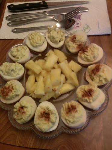 With a whisk, stir the yolks until you’ve got what looks like powder in your bowl. Get all the lumps out. Add all the spices and condiments, except for the Paprika, and begin to add your sauces a little at a time, until you’ve got a good “filling” consistency. You might need to add a little more pepper jelly, or you might not need the full 1/4 cup. It varies. I always put fresh pineapple chunks in the middle of the serving tray and get the necessary pineapple juice for the eggs from what drips off my hands as I cut it up. Oh hush. It’s no worse than kneading bread.